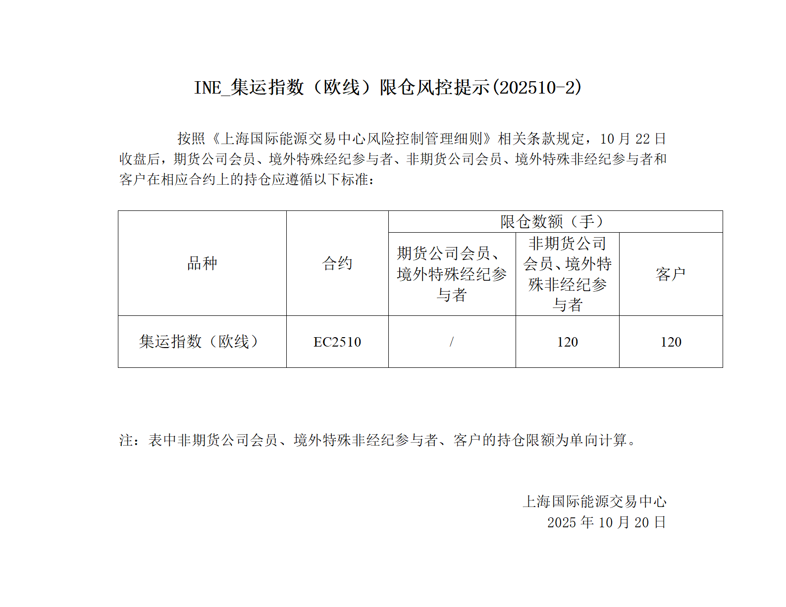 关于转发上海能源中心发布的集运指数(欧线)限仓风控提示