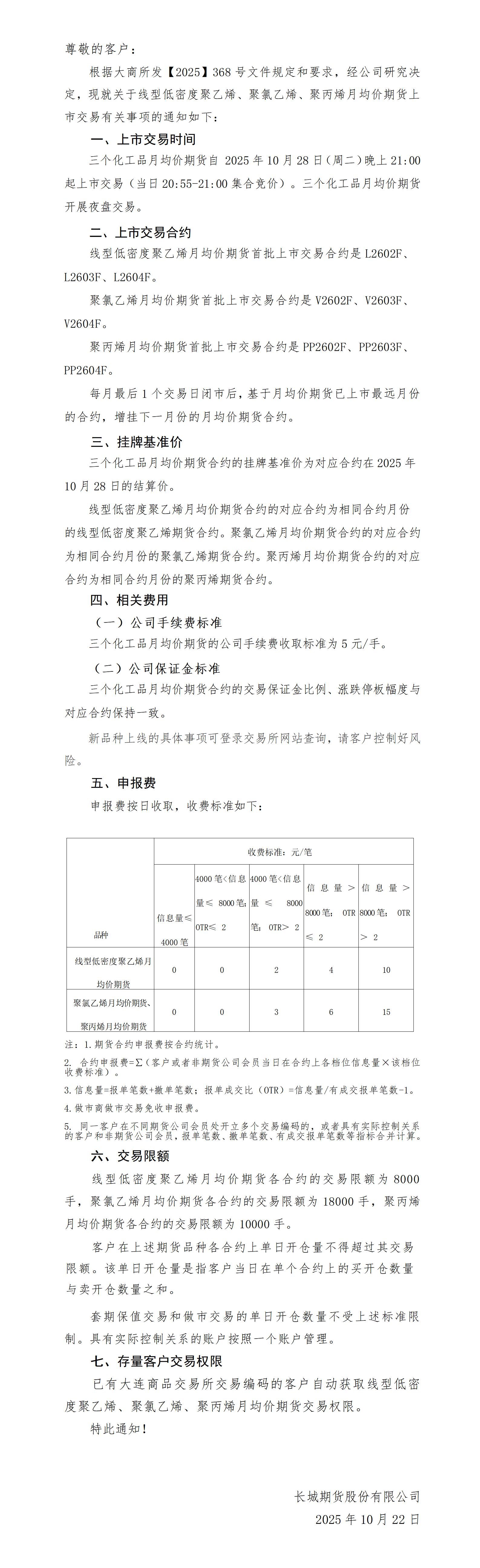 关于线型低密度聚乙烯、聚氯乙烯、聚丙烯 月均价期货上市交易有关事项的通知