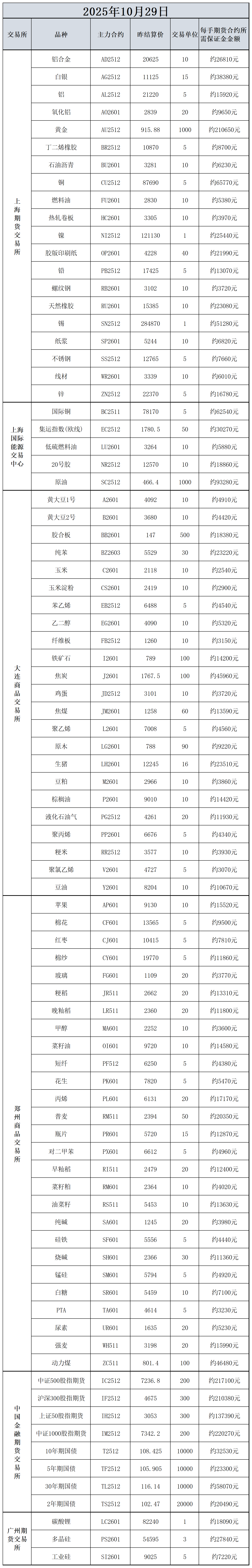 10月29日主力合约保证金数据表