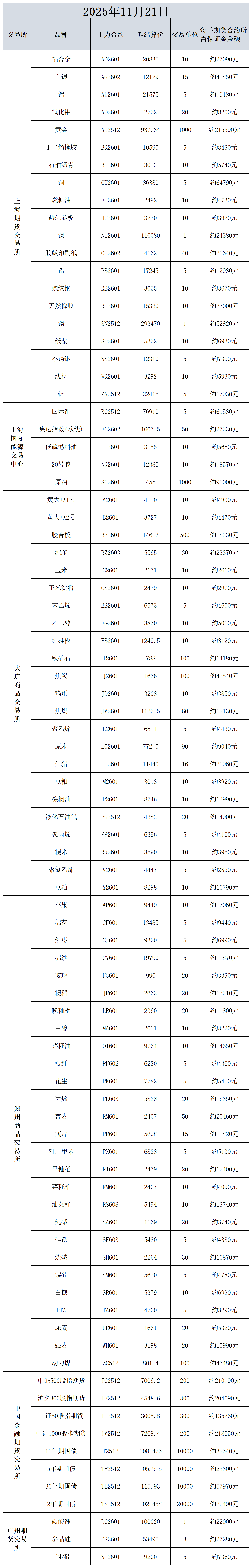 11月21日主力合约保证金数据表