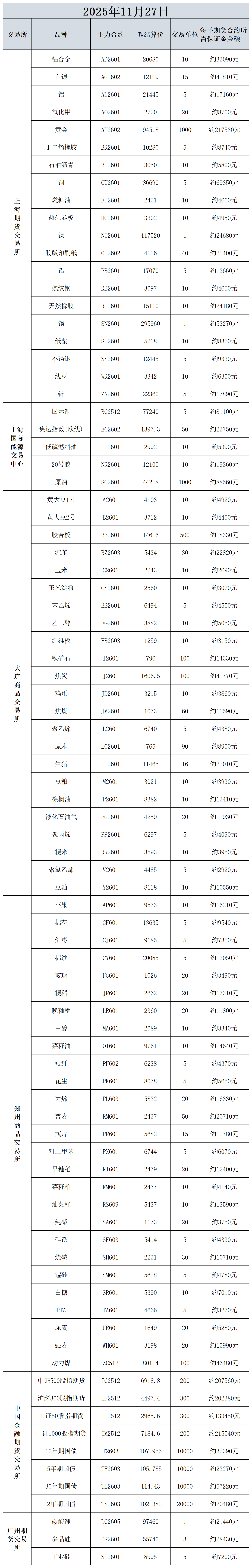 11月27日主力合约保证金数据表