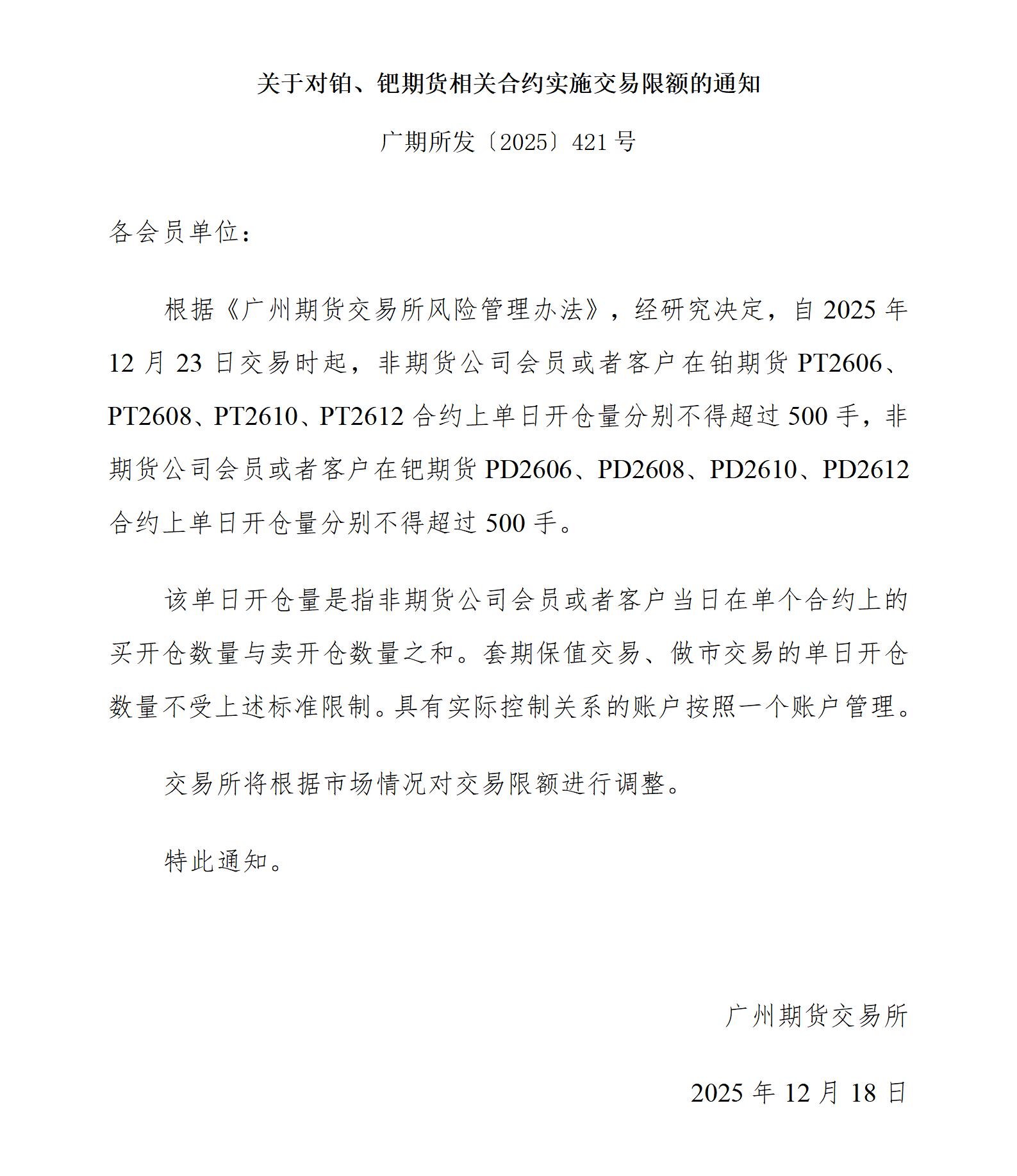 转发广州期货交易所发布《关于对铂、钯期货相关合约实施交易限额的通知》
