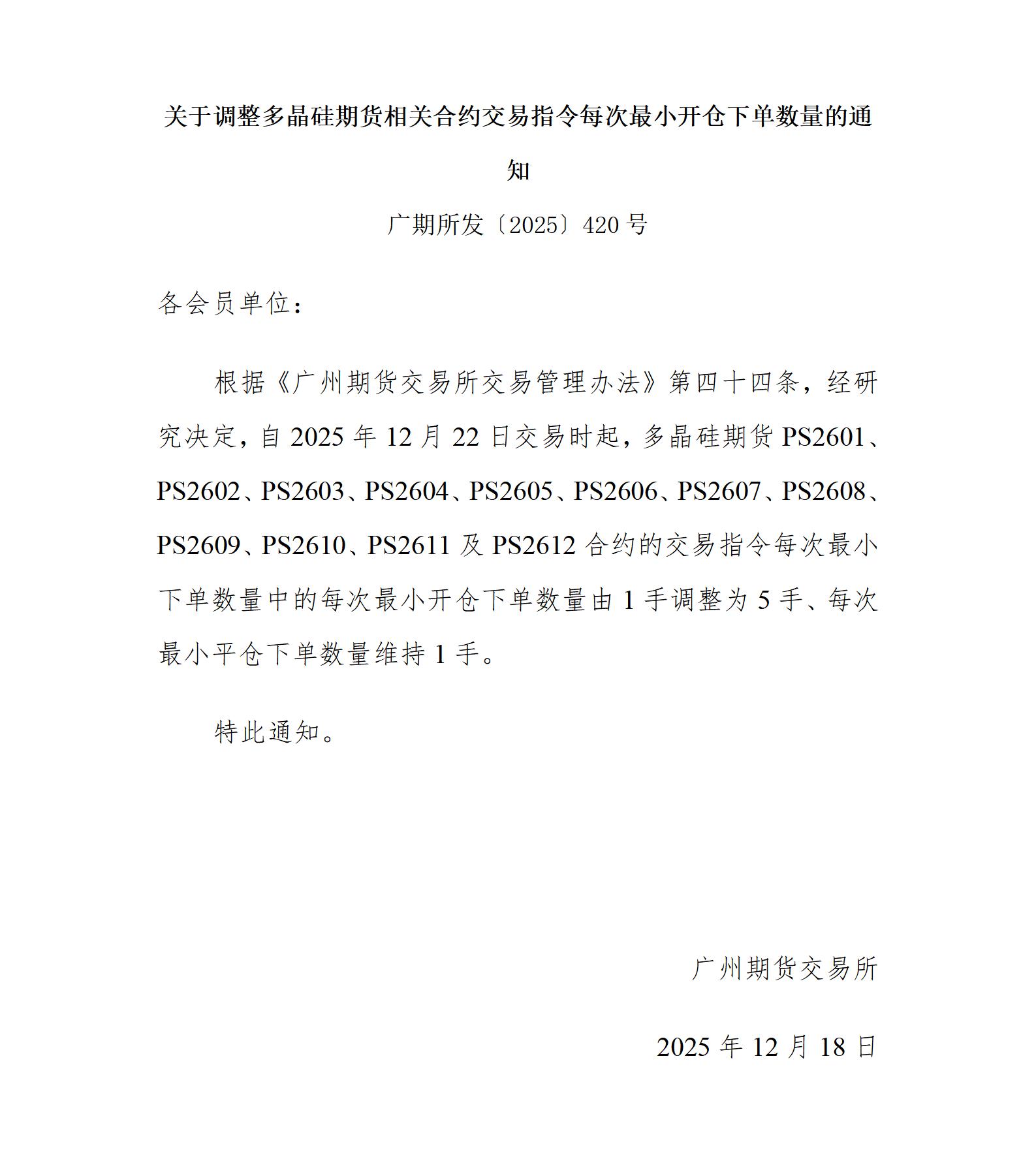 转发广州期货交易所发布《关于调整多晶硅期货相关合约交易指令每次最小开仓下单数量的通知》