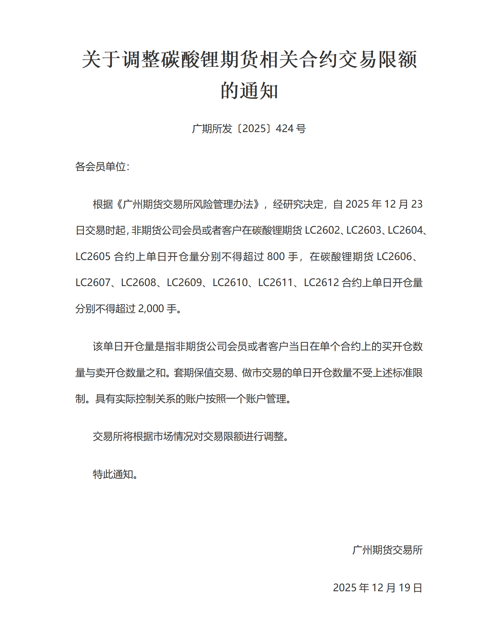 转发广州期货交易所发布《关于调整碳酸锂期货相关合约交易限额的通知》