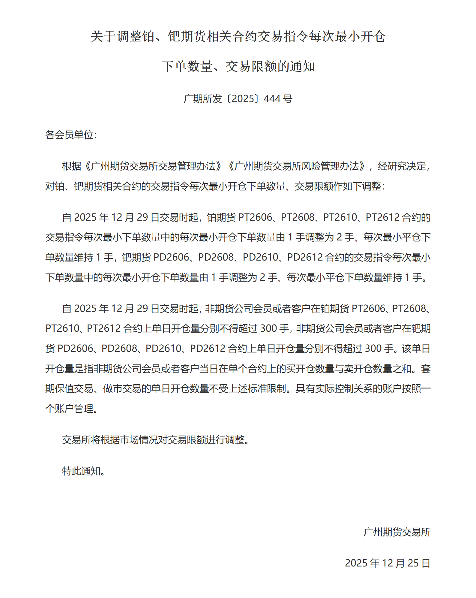 转发广州期货交易所发布《关于调整铂、钯期货相关合约交易指令每次最小开仓下单数量、交易限额的通知》