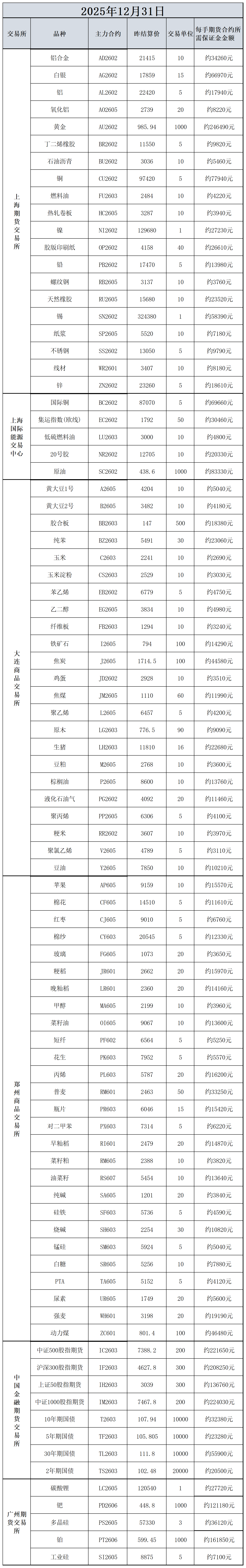 12月31日主力合约保证金数据表