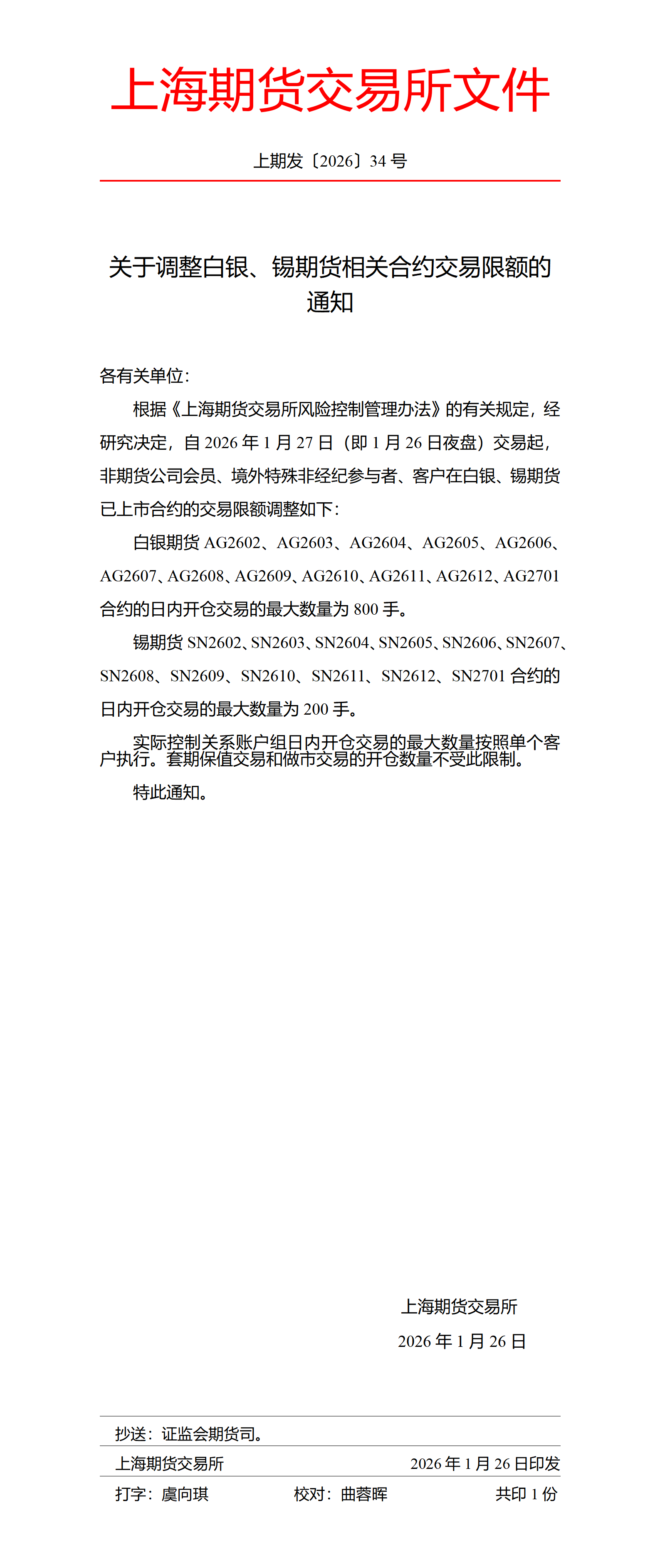 转发上海期货交易所发布《关于调整白银、锡期货相关合约交易限额的通知》