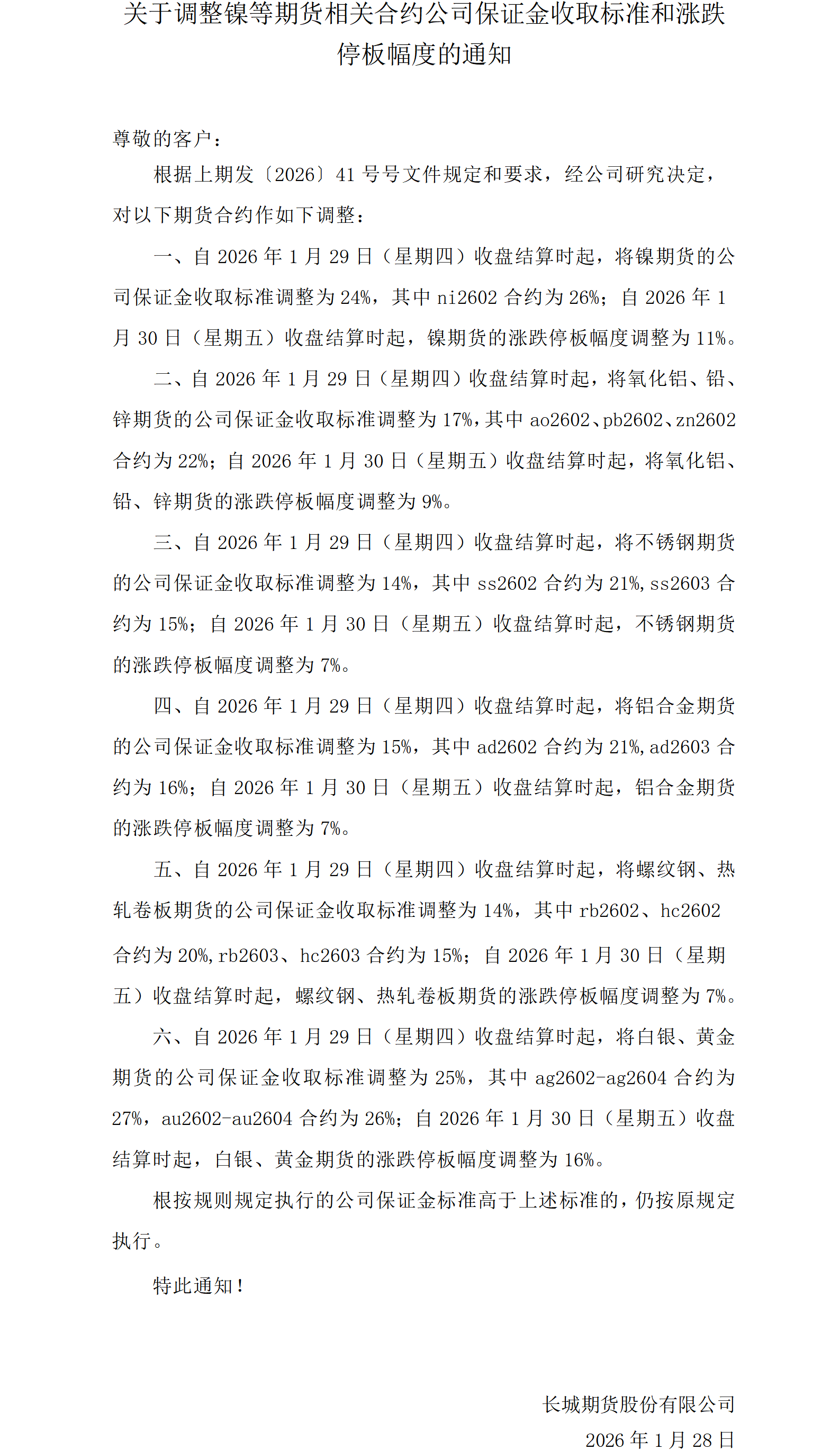 关于调整镍等期货相关合约公司保证金收取标准和涨跌停板幅度的通知