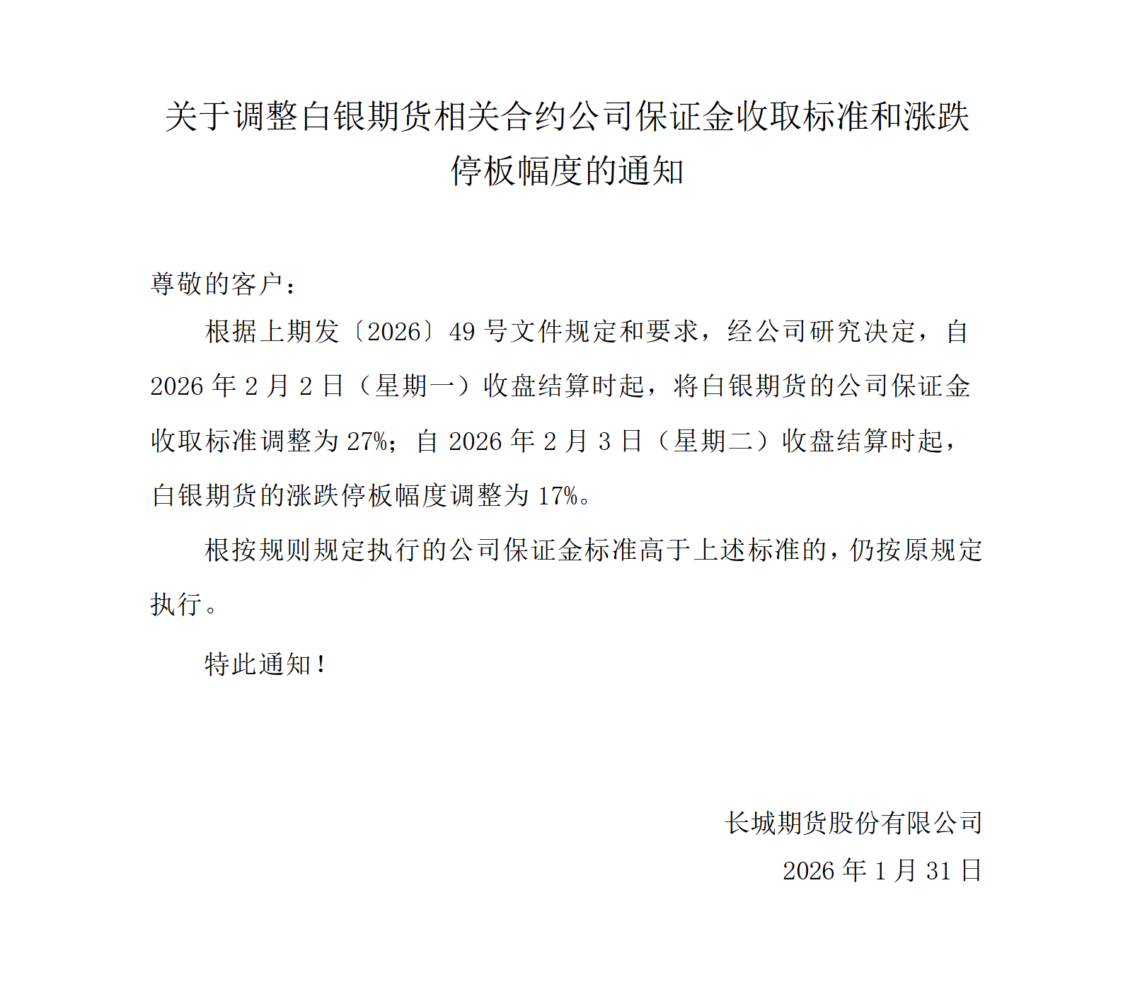 关于调整白银期货相关合约公司保证金收取标准和涨跌停板幅度的通知