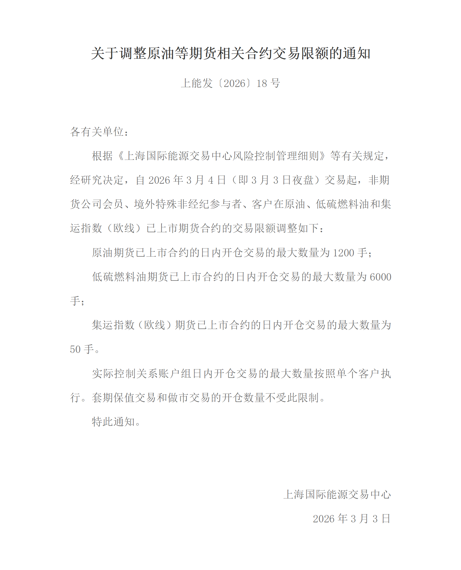 转发能源中心发布《关于调整原油等期货相关合约交易限额的通知》