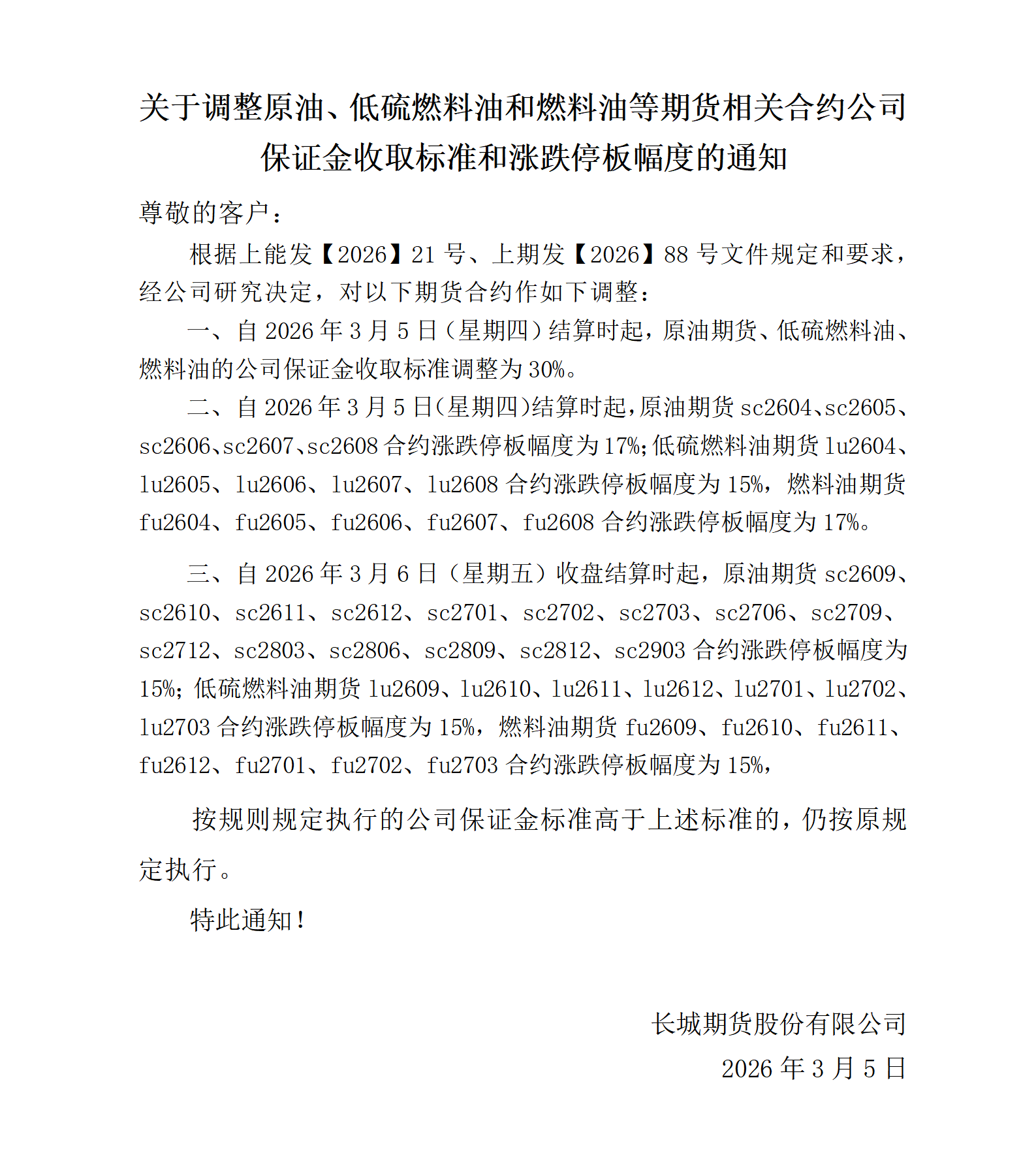 关于调整原油、低硫燃料油和燃料油等期货相关合约公司保证金收取标准和涨跌停板幅度的通知
