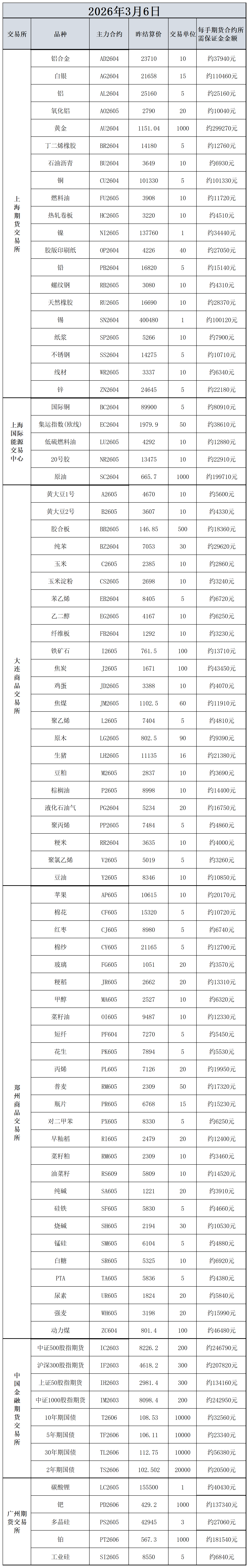 3月6日主力合约保证金数据表