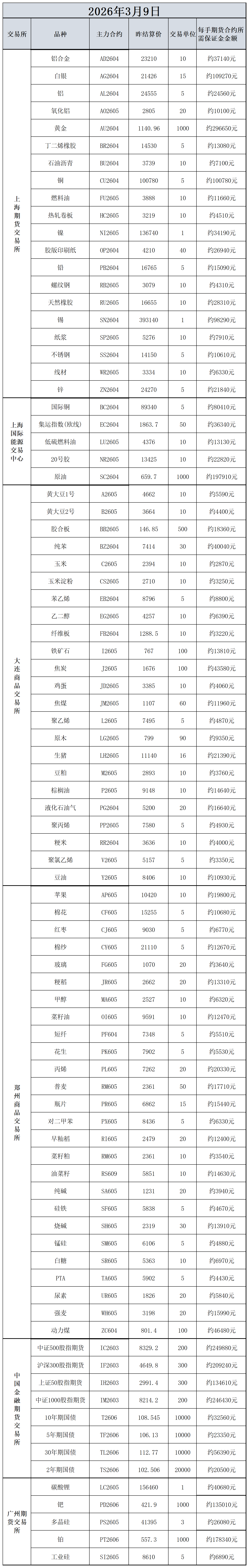 3月9日主力合约保证金数据表