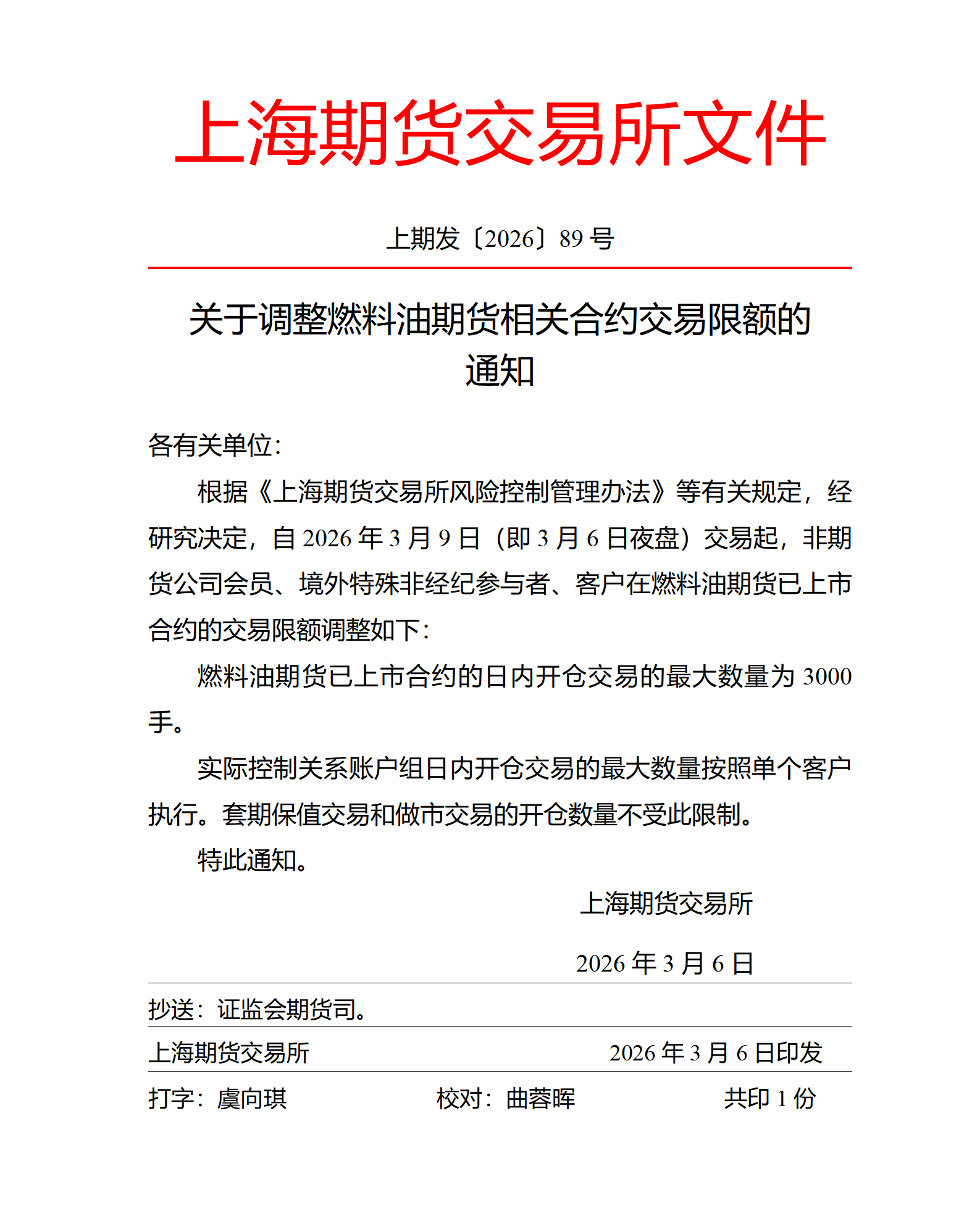 转发上期所发布《关于调整燃料油期货相关合约交易限额的通知》