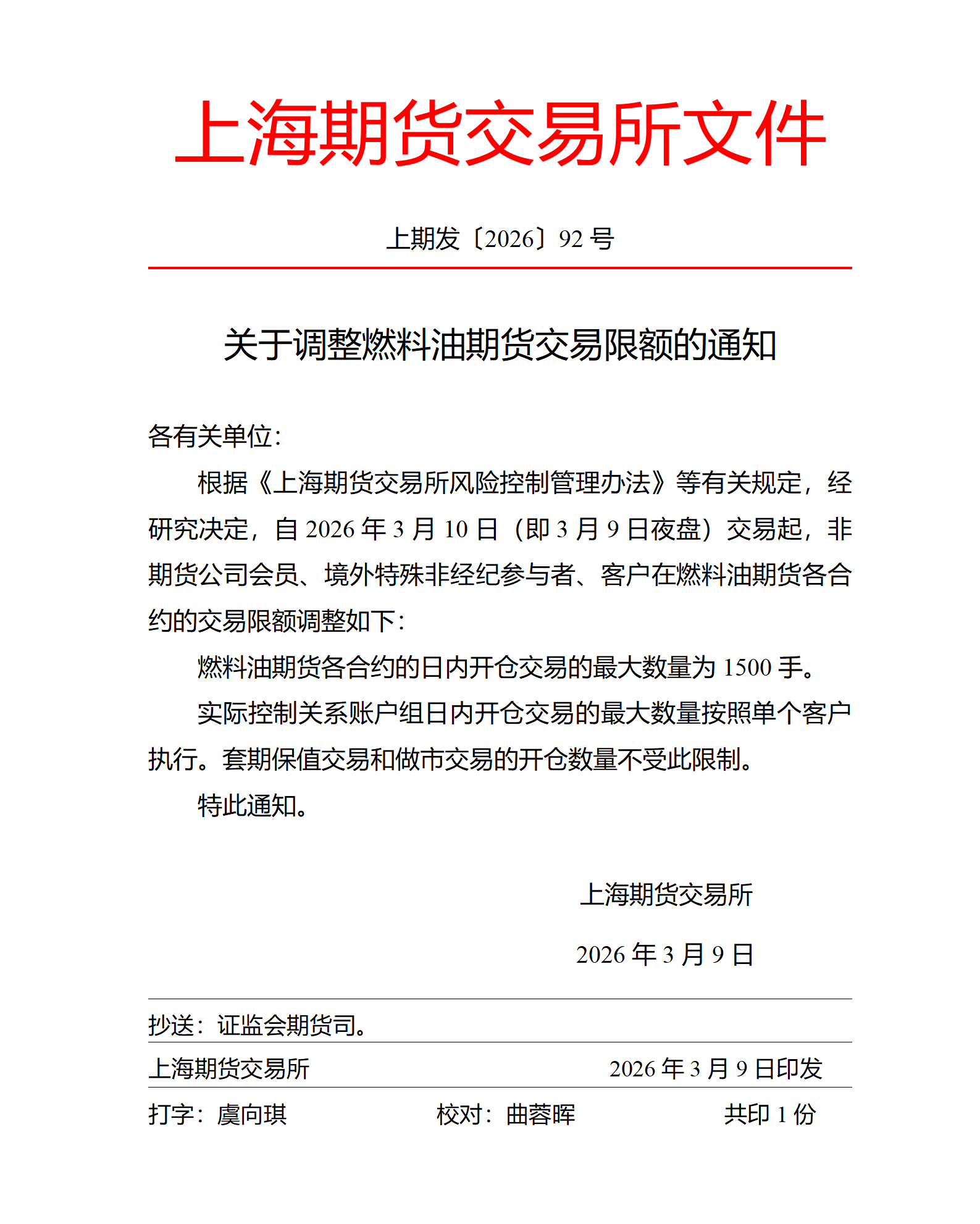 转发上期所发布《关于调整燃料油期货交易限额的通知》