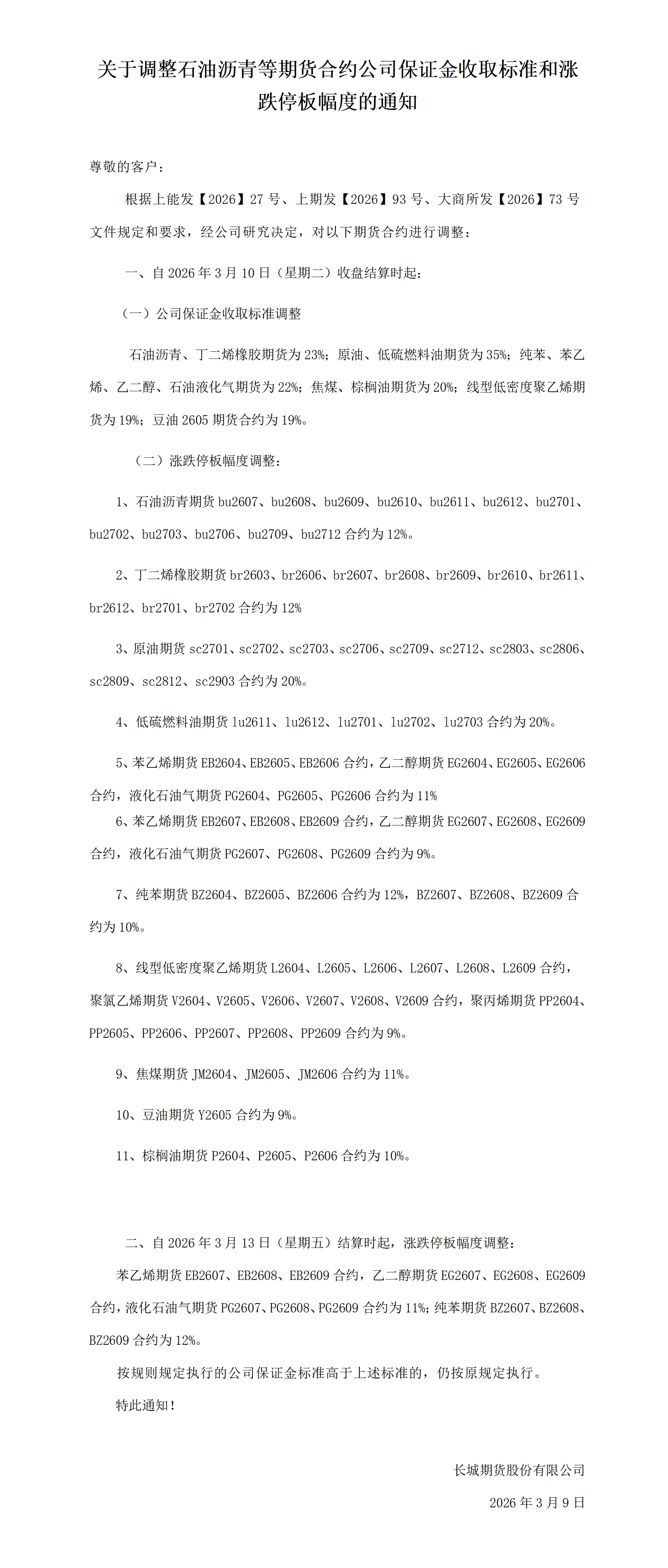 关于调整石油沥青等期货合约公司保证金收取标准和涨跌停板幅度的通知