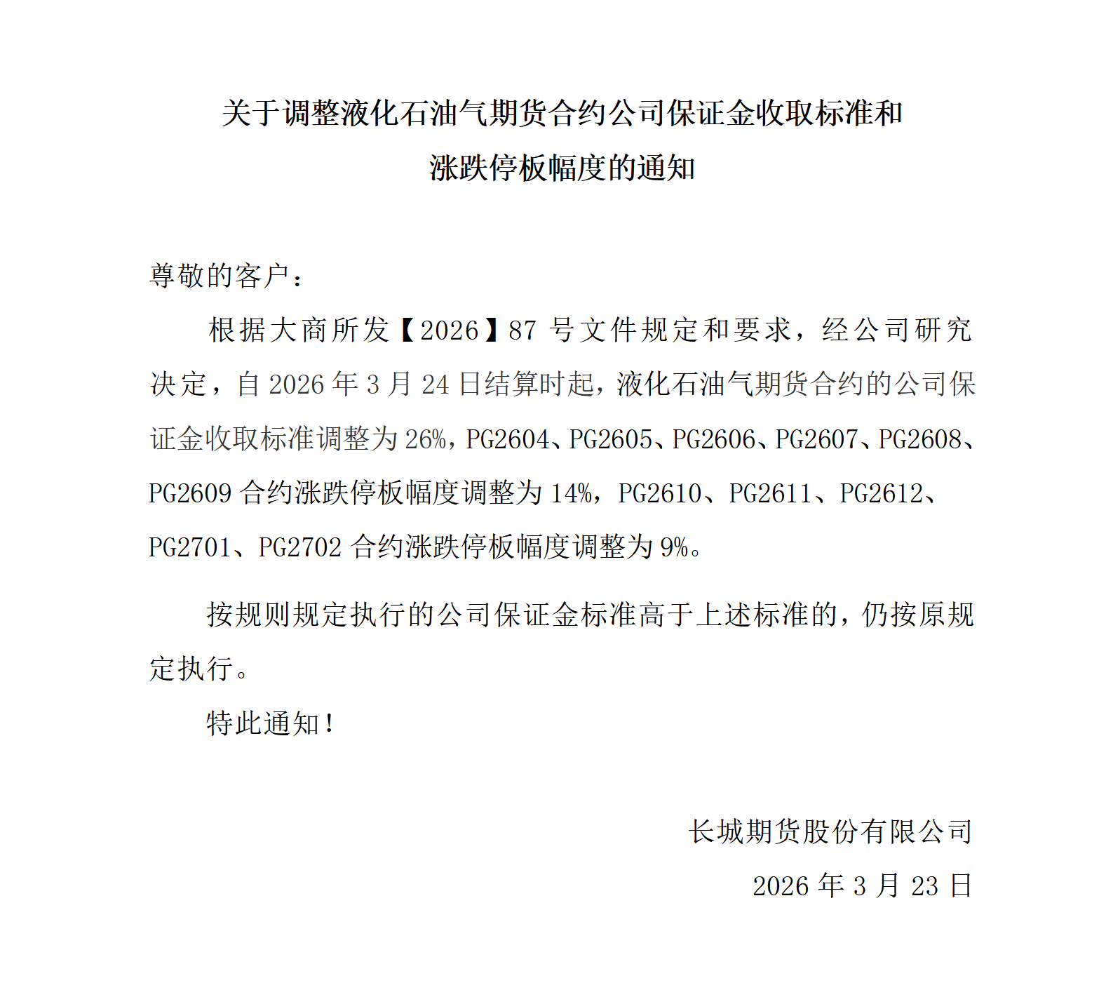 关于调整液化石油气期货合约公司保证金收取标准和 涨跌停板幅度的通知