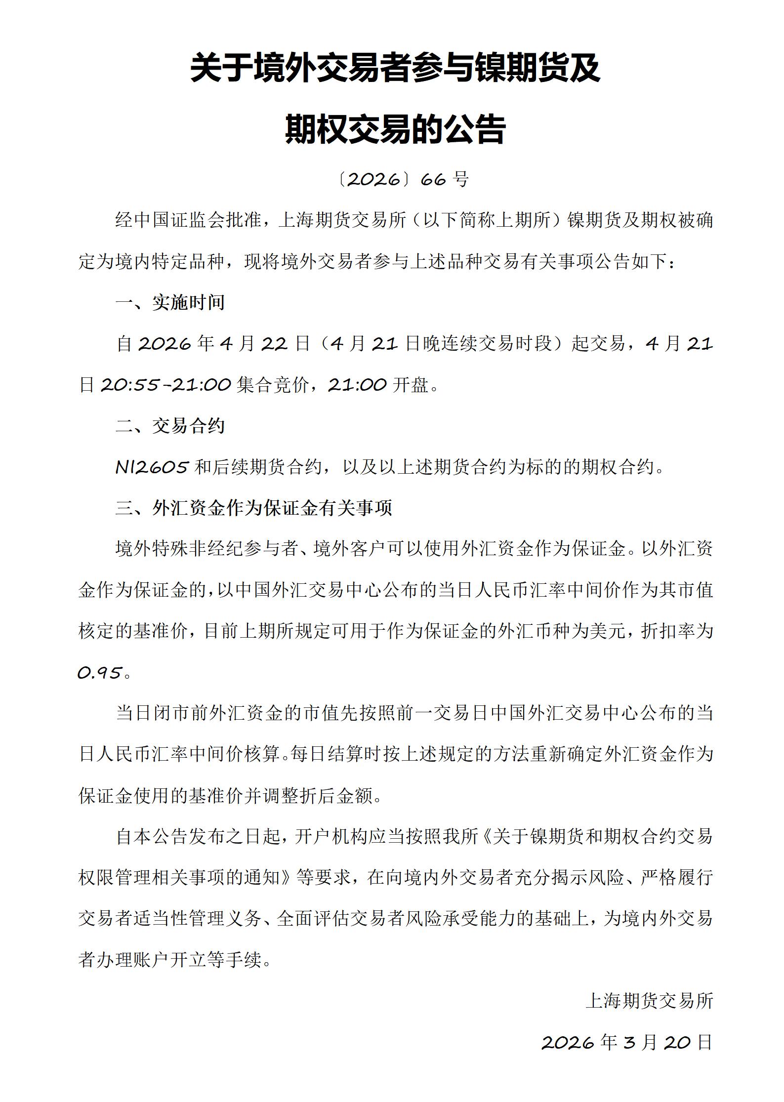 转发“上海期货交易所发布《于境外交易者参与镍期货及期权交易的公告》”
