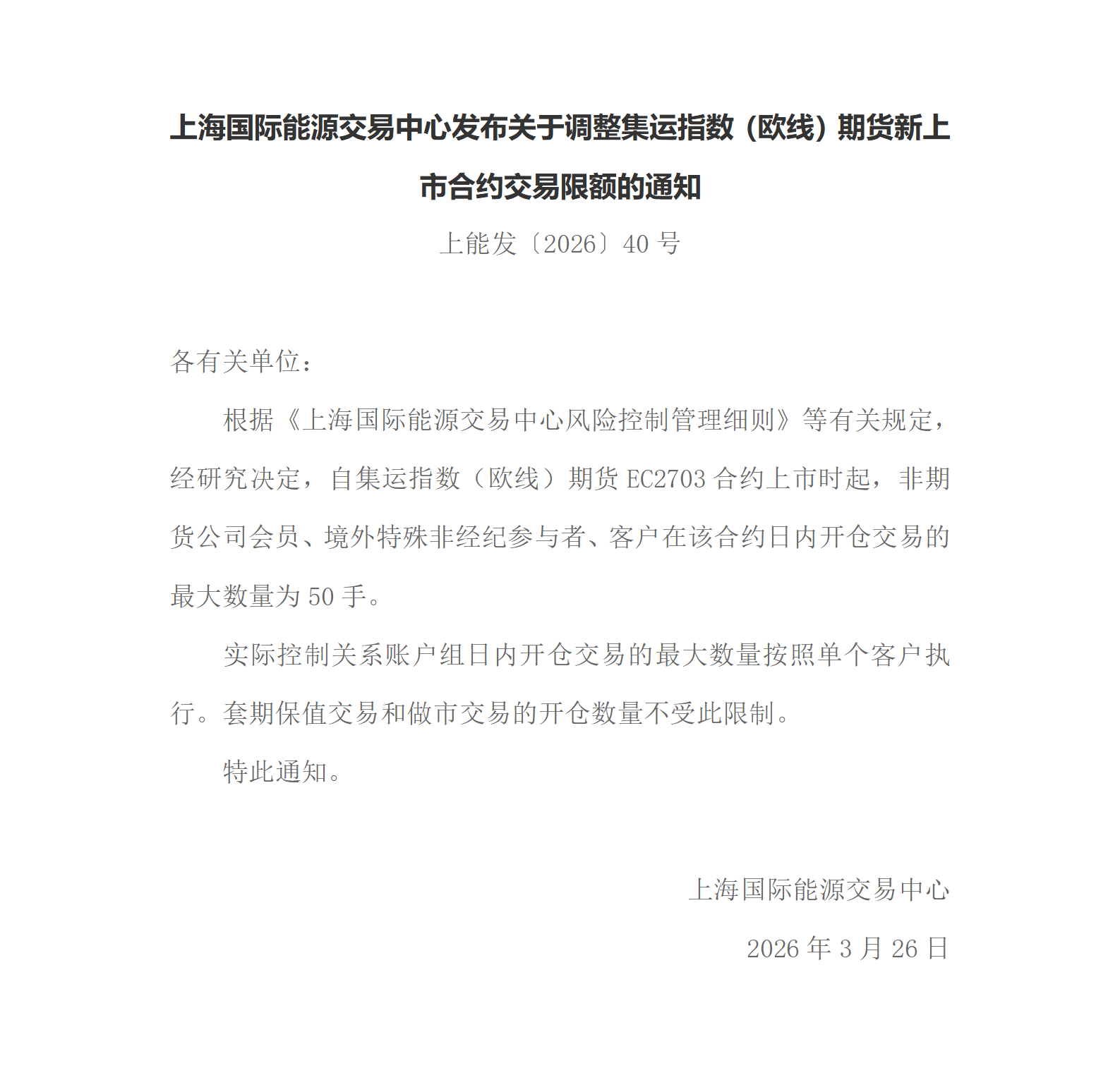 转发能源中心发布《关于调整集运指数(欧线)期货新上市合约交易限额的通知》