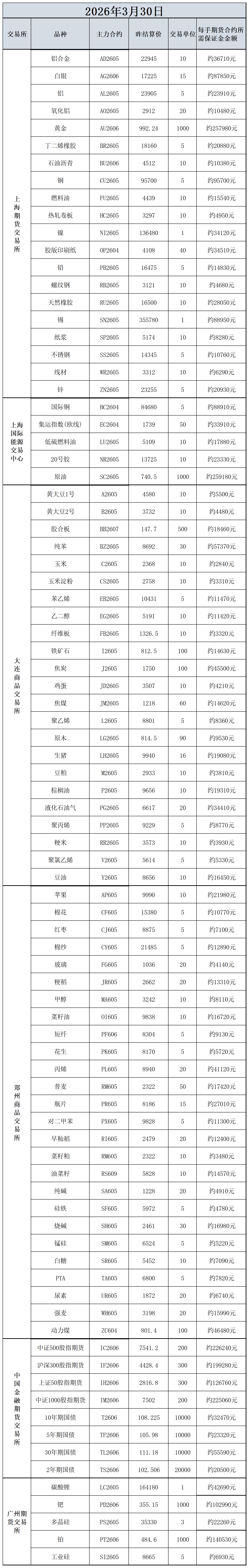 3月30日主力合约保证金数据表