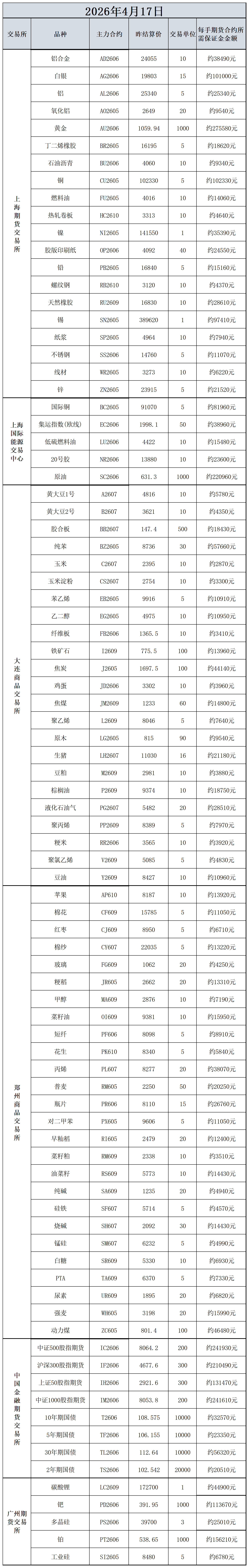 4月17日主力合约保证金数据表